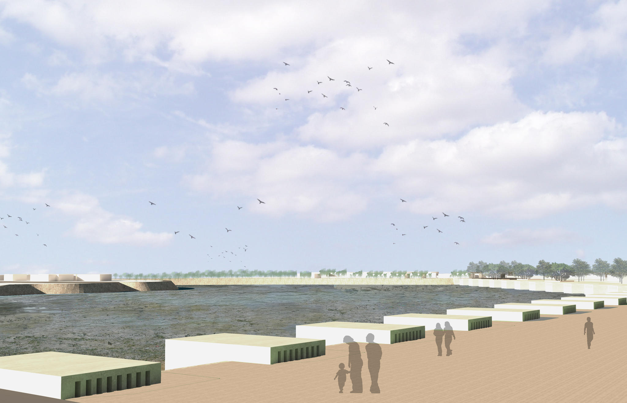 The rapar lake is located amidst a network of roads and tends to swell and overflow onto them during the monsoon. The proposal creates one large patch of land with shallow waters as an offset from the road edge by designing a wide band of linearly placed percolation wells embedded in the land that takes excess water flow and recharges the groundwater levels, thus thoroughly preventing any surface flooding. Meanwhile, the shallow water patch would attract indigenous or migratory bird species visible from the road edge while the percolation tank top platform acts as a recreational space for people to interact with the lake.