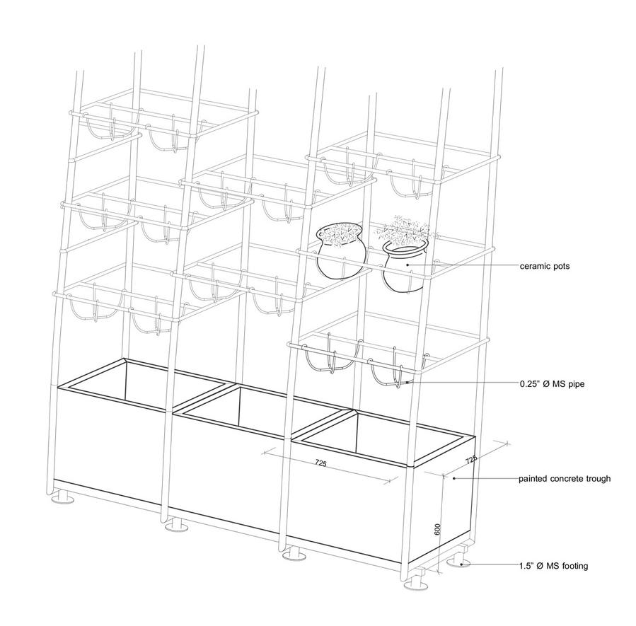 For this we came up with a custom made vertical garden, formed from interlocked bent pipe mild steel frames, and anchored with a floating foundation of exposed concrete planters. The system had to be simple to construct and simpler to maintain, with robust plants to withstand the southwest sun. Each vertical frame stands on its own feet, weighted by its concrete planter. Neighbouring frames are interlocked with smaller, alternating mild steel pipes. These were welded together on site and tilted up into place. Then the concrete planters were placed inside and filled. The same interlocking pipes support a mild steel rod basket for ceramic pots which each hold a combination of upward growing and hanging plants that climb out of their perch to eventually camouflage the frame that supports them. The pots step back as they rise, pushing the overall centre of gravity toward the centre of the planter, and helping to stabilize the structure, even in high winds. A drip irrigation system runs along each pot, irrigating the plants while at the same time turning the whole screen into a wet, porous mesh whose evaporation cools the hot prevailing south-westerly winds that pass through it.